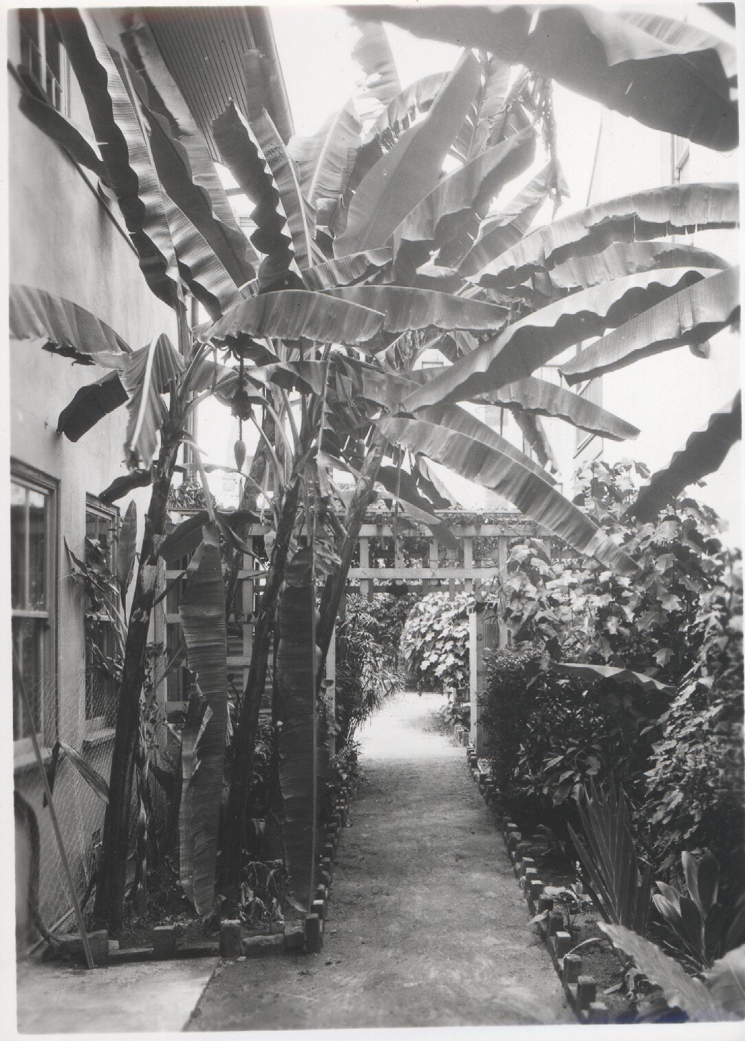 Black and white photograph of the garden path at the rear of the Kodak Australasia Pty Ltd branch store and same day processing laboratory on Flinders St, Townsville, Queensland, in the 1930s. The walled garden, running between two buildings, has garden beds of tropical plants like bananas, pines, cordylines, vines and shrubs either side of a path lined with bricks. The path leads underneath an arbour or pergola made of latticed wood, covered in vines.