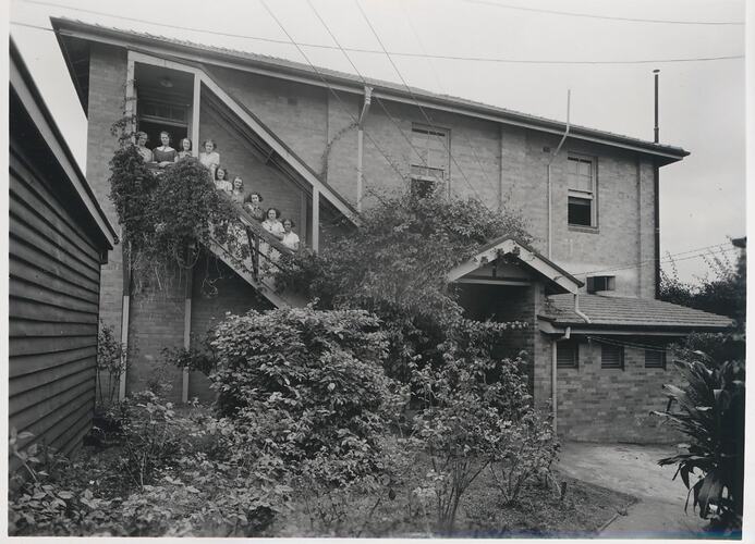 Black and white photograph of the Kodak Australasia Pty Ltd developing & printing team from the processing laboratory in Townsville, Queensland, in the 1930s. The group of 9 women are standing on the stairs at the back of a two storey brick building, with rose bushes and vines in the garden in the lower foreground.