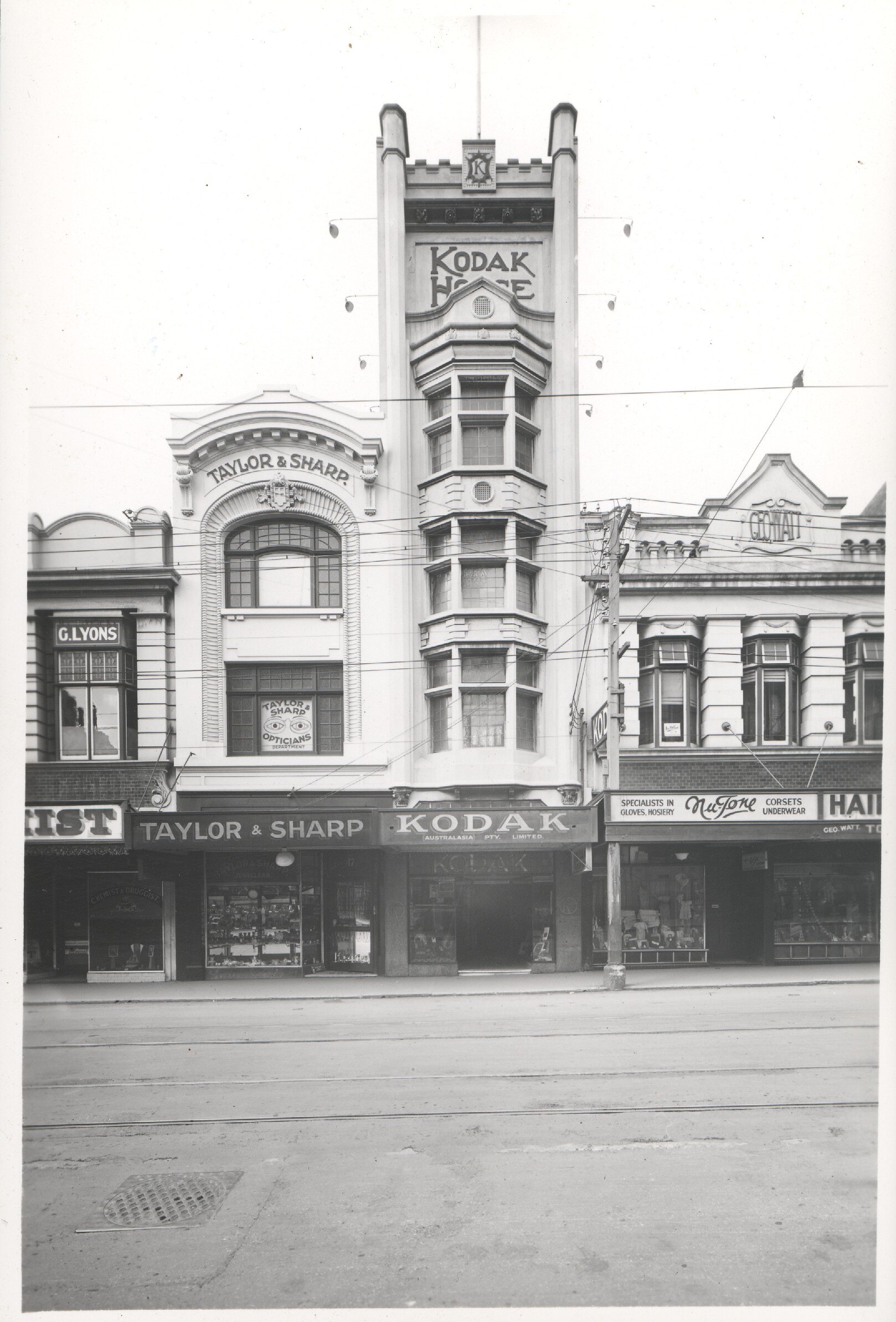 Street view of Kodak House, with shop front at street level and three upper storeys with bay windows, and decorate facing and turrets at the top with 'Kodak House' sign adhered to building frontage. At street level there are neighbouring buildings 'Taylor & Sharp' and 'Nu Tone', with tram tracks and wires visible on the street in the foreground.