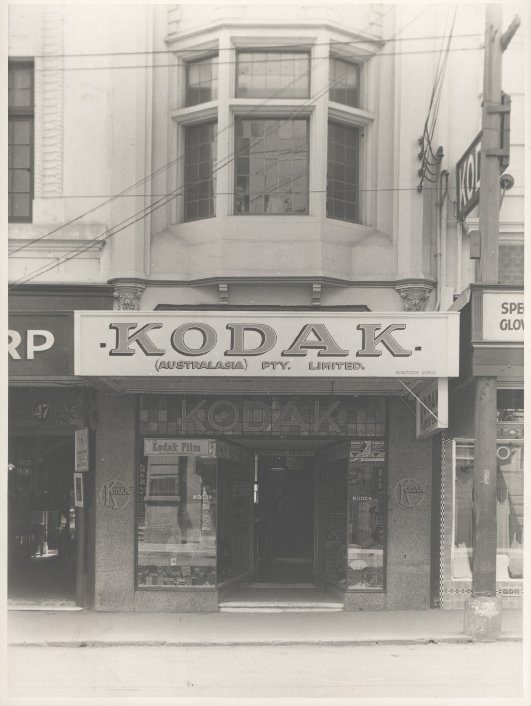 Shop front with Kodak Australasia Pty Ltd sign on awning and glass windows at street level either side of a recessed entranceway. Above the first floor is a mullioned or muntin bay window, where a man is standing.