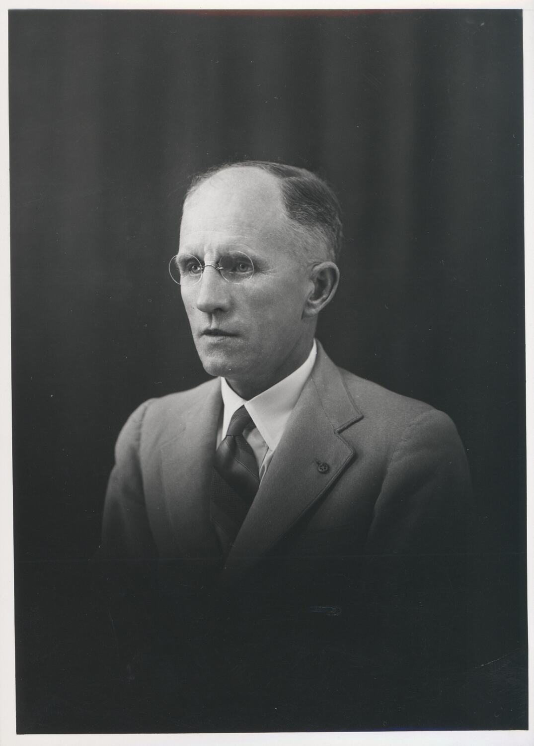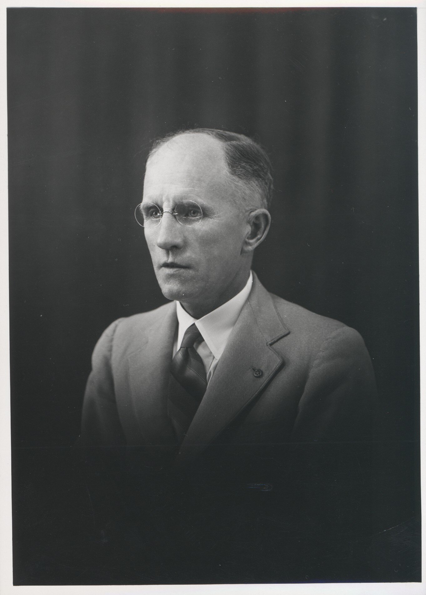 Head and shoulder portrait of a man in suit and tie, with frameless pince nez glasses. He is seated against a dark curtained backdrop in a studio and the lower half of the image has been blurred or shadowed.