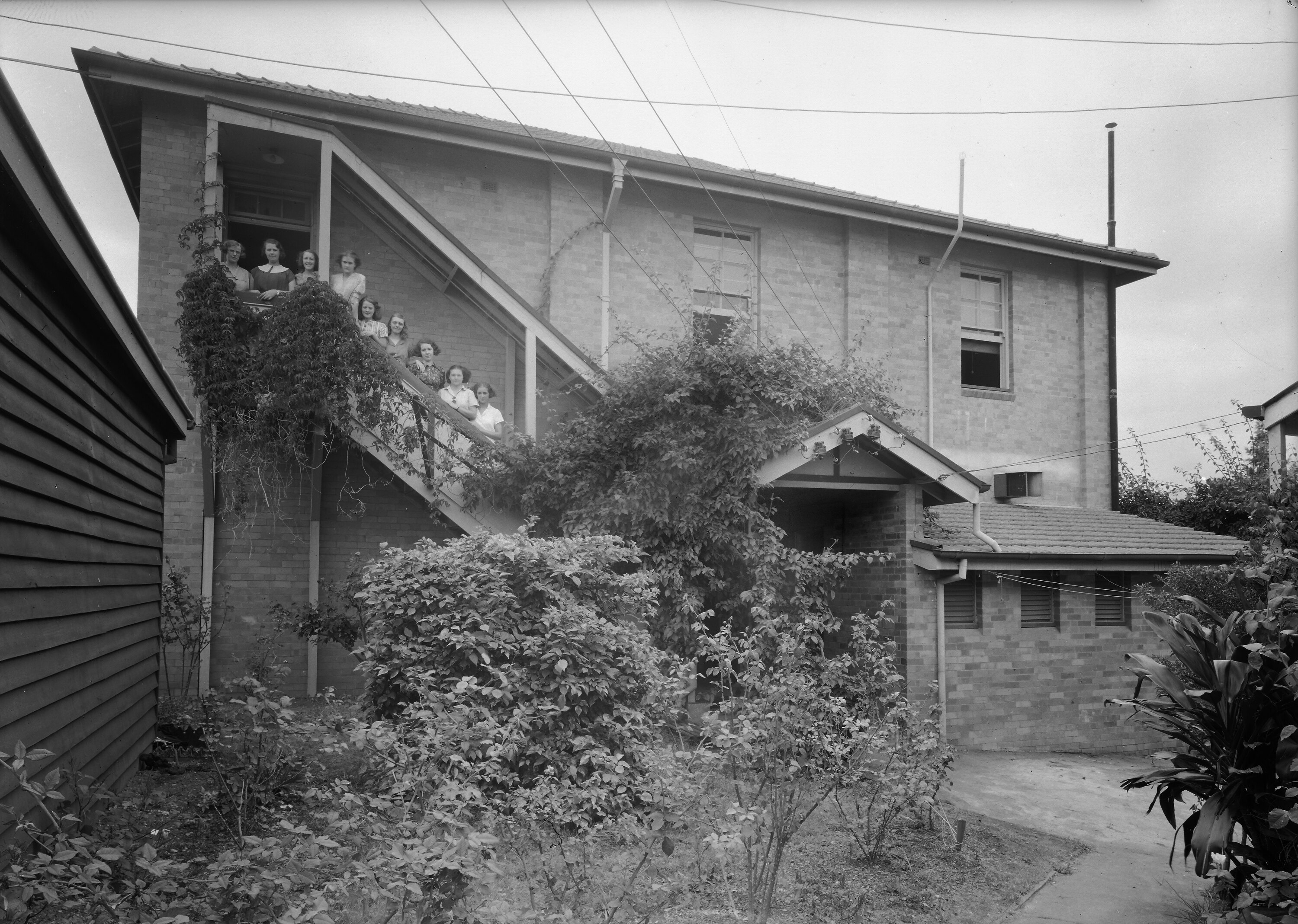 9 women on stairs at rear of two storey brick building. Photo is taken from ground level with rose bushes in foreground.
