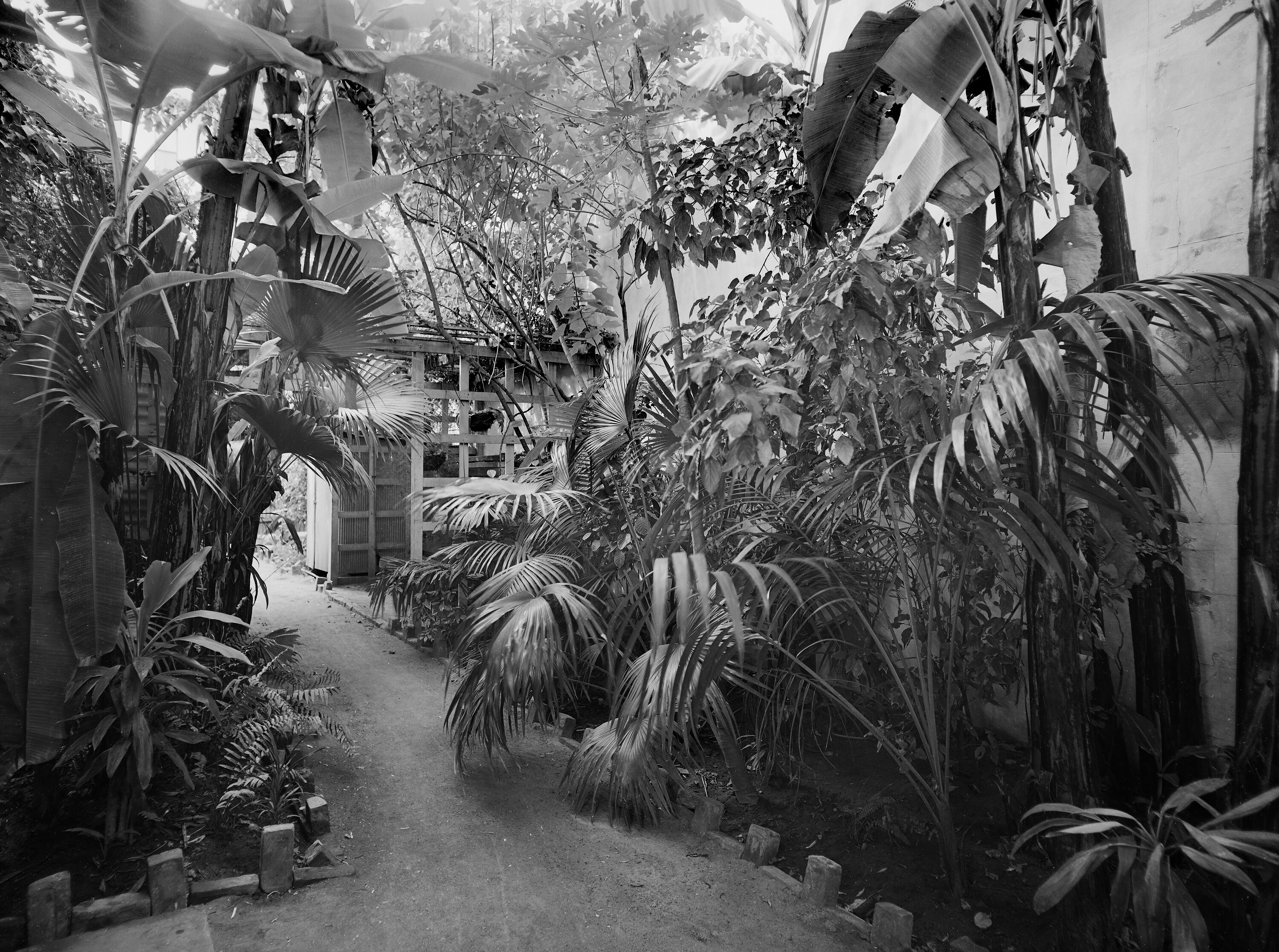 Black and white film negative of the garden at the rear of the Kodak Australasia Pty Ltd branch store and same day processing laboratory on Flinders St, Townsville, Queensland, in the 1930s.
