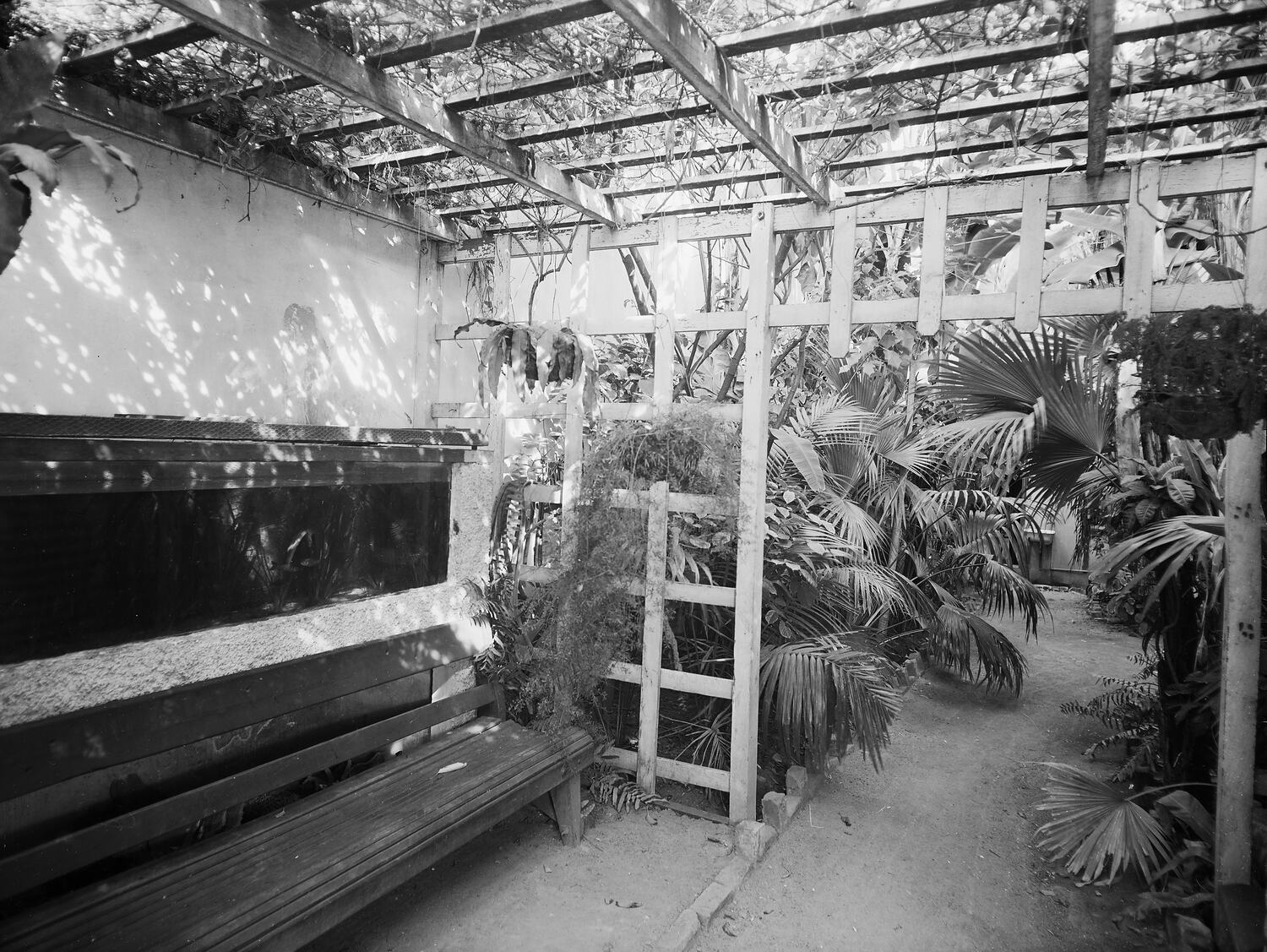 View of garden seat underneath a wooden pergola or lattice framework, covered in vines. There is a path leading to a wall, against which there is an outdoor sink. The path is linked with thick tropical vegetations, including fantail palms.