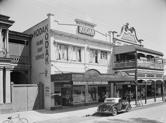 Street view of a two storey building with Kodak signage. There is also a Queensland Tourist Bureau sign hanging from the awning. Kodak products are visible in the display windows. A car and bicycles are parked on the street. There is a building next door, 'Willmett's' Printers and Newsagency, which has a second storey verandah and a man and woman can be seen walking beneath it on the footpath.