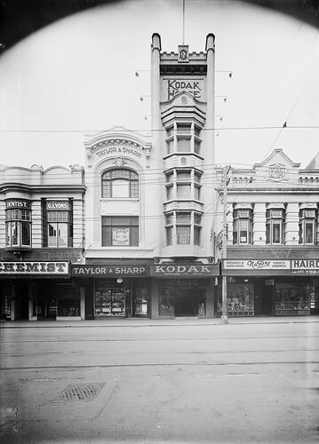 Street view of Kodak House, with shop front at street level and three upper storeys with bay windows, and decorate facing and turrets at the top with 'Kodak House' sign adhered to building frontage. At street level there are neighbouring buildings including a chemist, 'Taylor & Sharp', 'Nu Tone', and a hairdresser, with tram tracks and wires visible on the street in the foreground.