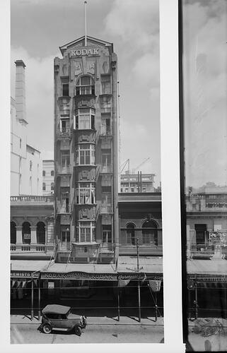 Oblique street view of multistorey Kodak building with 'Kodak 1914' applied in large lettering to the front of the building, which has art deco finishing, mullioned bay windows down the centre and small verandas each side. The photograph shows neighbouring high rises and a car parked on the street. To the far right, beyond the area that a mask has been applied to delineate an area for developing, a man with crutches and a top hat can be seen leaning against an awning pole, and in front of him on the street is a motorbike with sidecar.