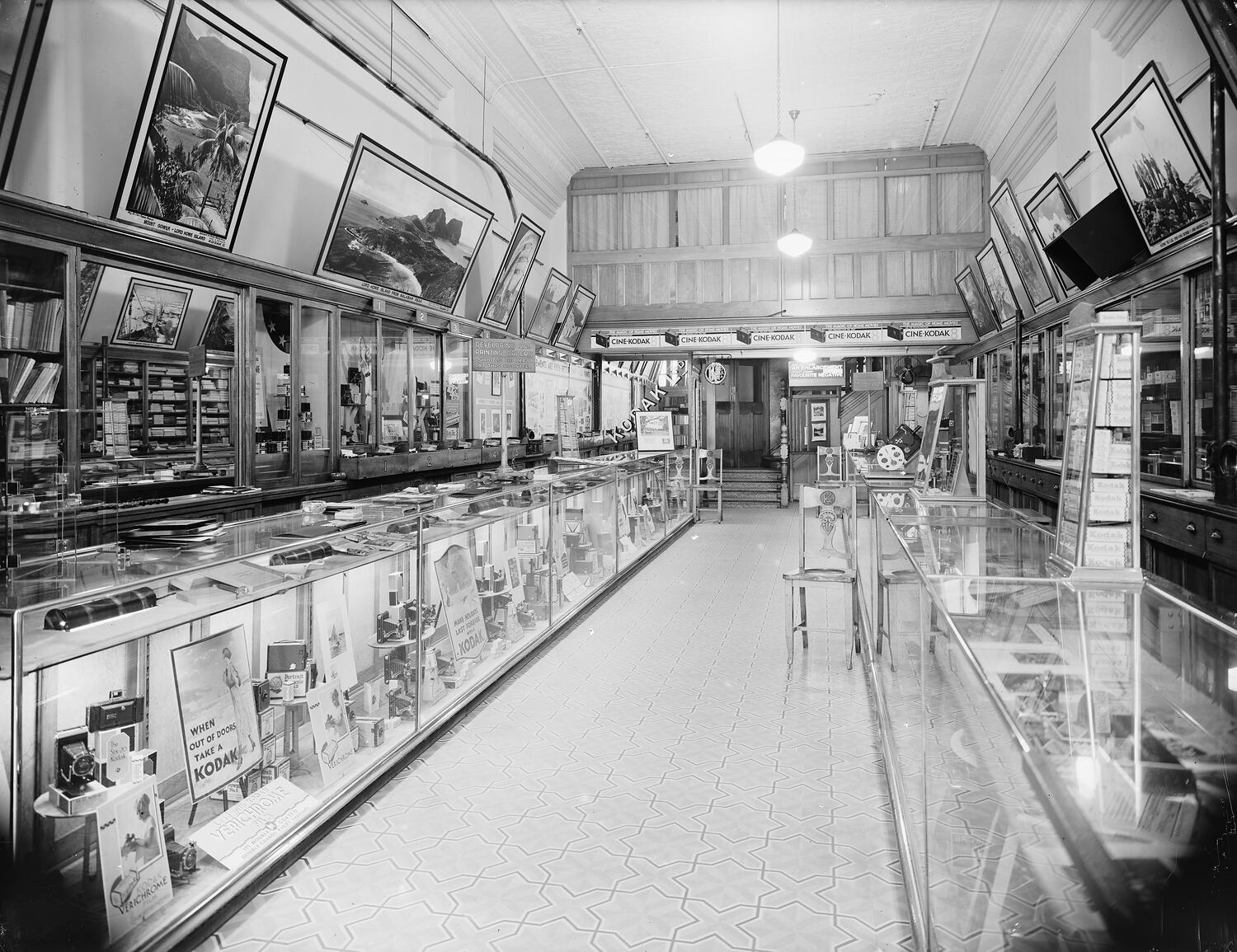 Black and white full plate glass negative of the interior of a Kodak Australasia Pty Ltd shop, with two glass fronted counters filled with products and signage running the length of the shop, to a rear door up three steps, marked 'No Admittance'. There is a patterned, tiled or laminated, floor and several wooden chairs with 'K' for Kodak carved into their backs. Photographs are hung along the picture rail the length of the room.