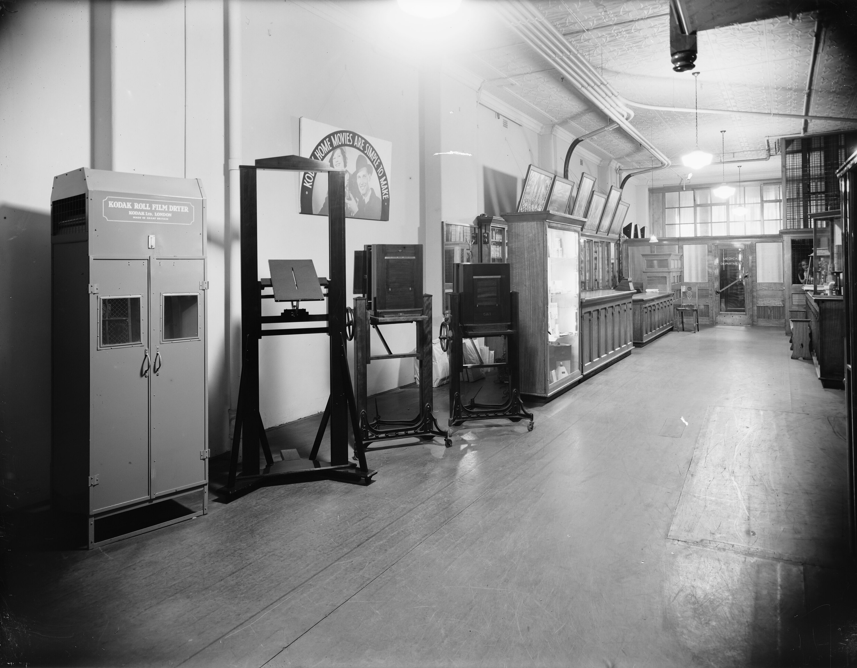 Photographic sales showroom - a wide wooden room, walls lined with counters, and display cabinets. In the foreground are several large pieces of Kodak equipment - a Kodak Roll Film Dryer cupboard and large studio plate cameras. A woman is visible inside the lift shaft at the rear, right of the image. A door at the back of the room is marked 'Medical Department'.
