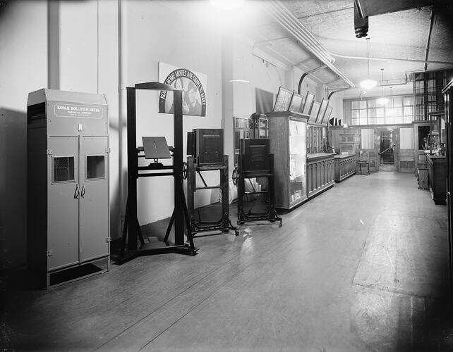 Black and white full plate glass negative of the interior of a Kodak Australasia Pty Ltd retail showroom - a wide wooden room, walls lined with counters, and display cabinets. In the foreground are several large pieces of Kodak equipment for use by professional photographers - a Kodak Roll Film Dryer and large studio plate cameras. A woman is visible inside the lift shaft at the rear, right of the image. There is a door at the back of the room leading to the Medical Department.
