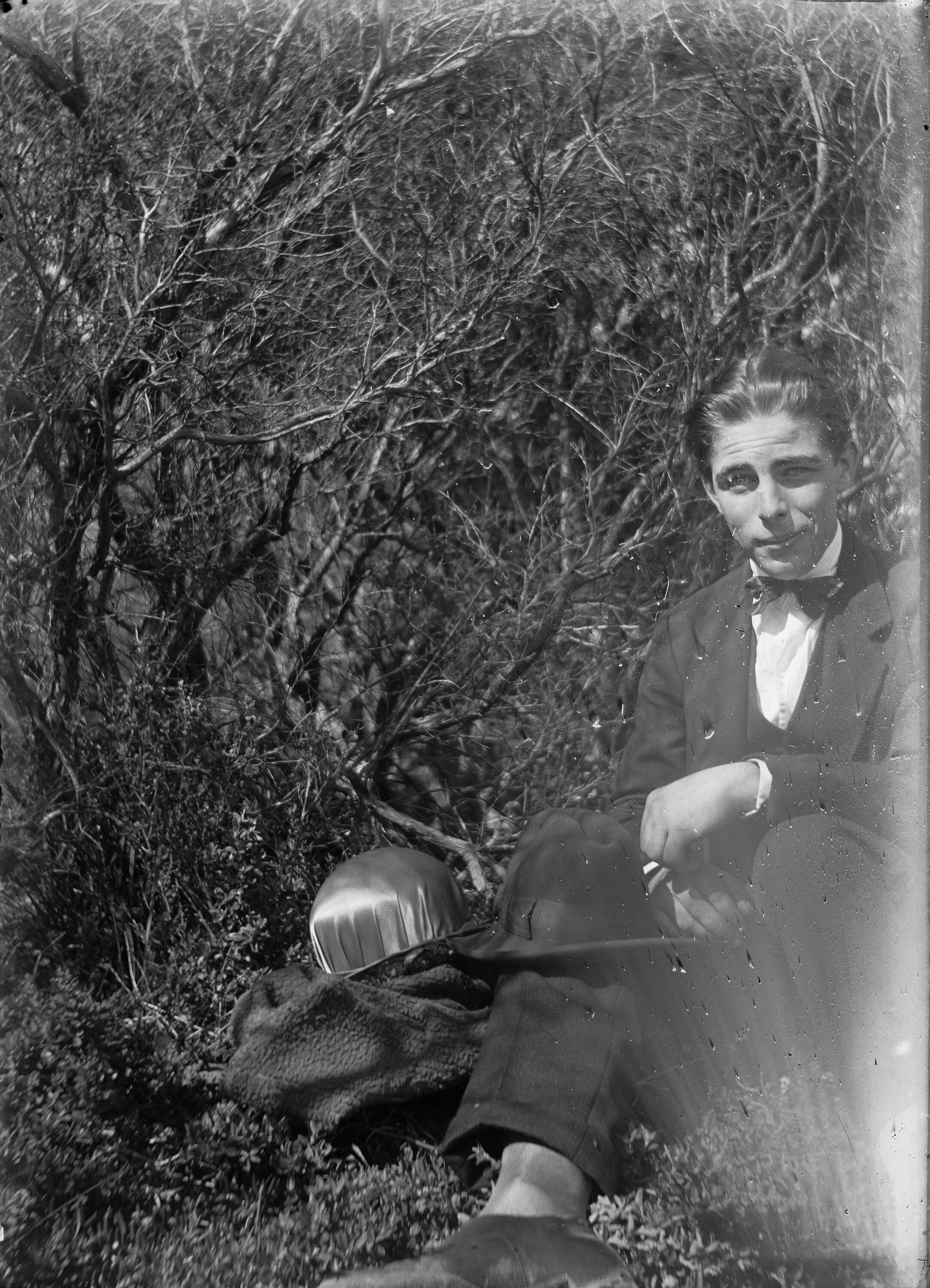 Black and white 1/6th plate glass negative of a man seated underneath low branches or bushes. Next to him on a rug or coat is a woman's hat. The provenance of the image is unclear but it was housed in Kodak's corporate museum.