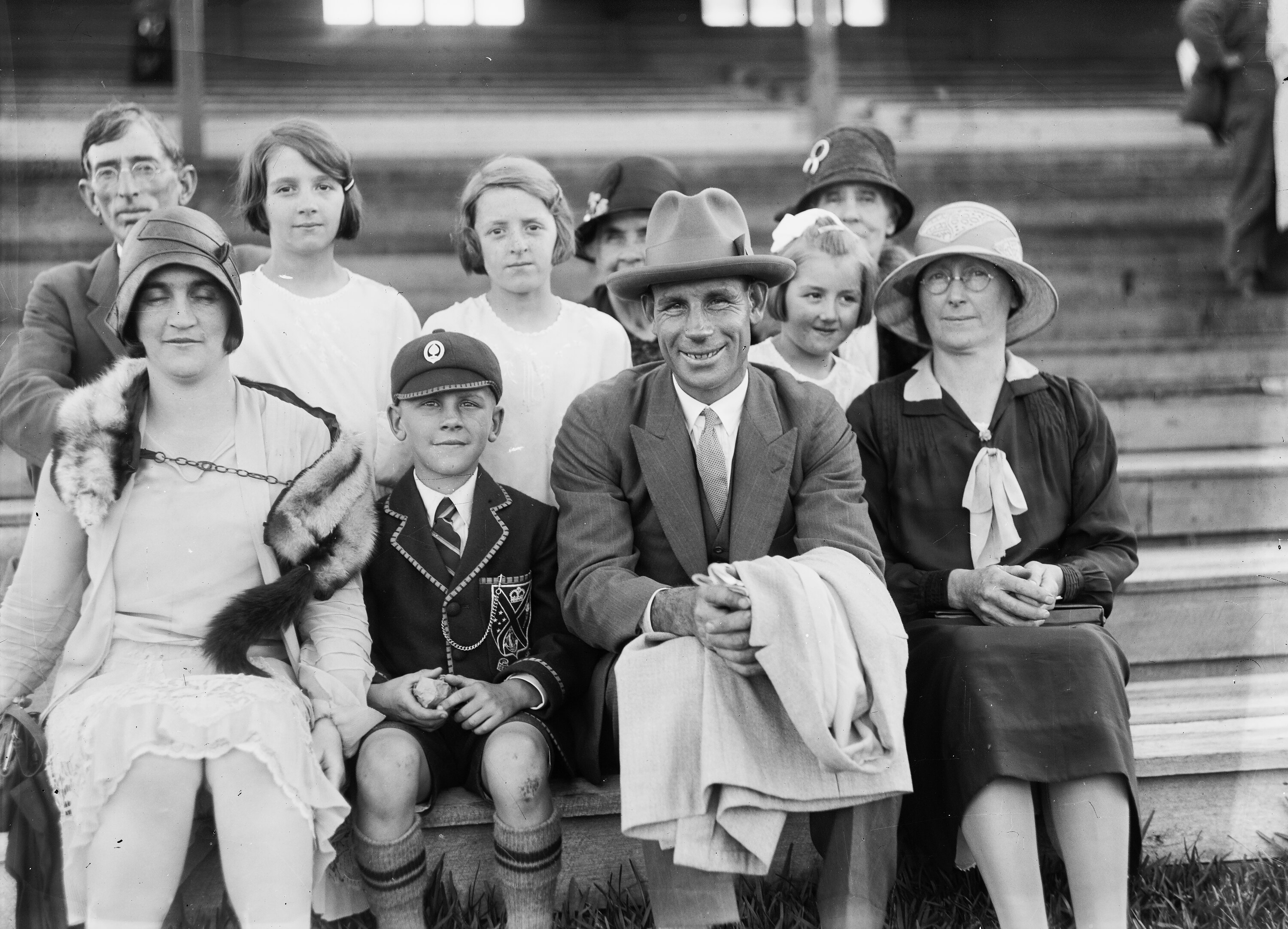 A black and white, half plate negative featuring a family group portrait of men and woman seated on stairs with a young boy in school uniform, with crested blazer and cap.The provenance of this image is unclear, but it came from the Kodak corporate museum at Coburg.
