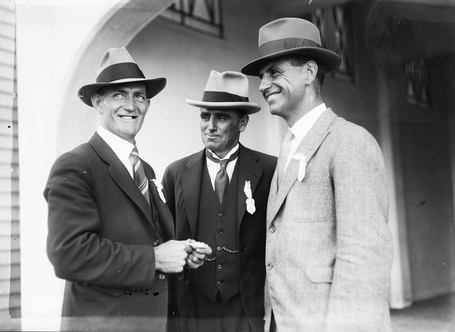A black and white, half plate negative featuring three men under an archway, laughing. Each man has a medal on his breast pocket/lapel. One man holds a small wallet or book. The man in the middle is wearing a medal that reads 'President' however, it is too difficult to make out the Society's name. The provenance of this image is unclear, but it came from the Kodak corporate museum at Coburg.
