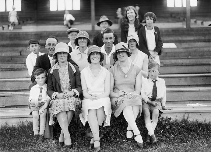 A black and white, half plate negative featuring a group portrait of men, women and children in a sports stand. These are likely the family and friends of children participating in the races seen on accompanying negatives. The provenance of this image is unclear, but it came from the Kodak corporate museum at Coburg.
