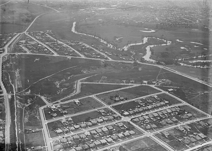 A black and white, half plate negative featuring an aerial view of suburbs and creeks possibly Coburg. The provenance of this image is unclear, but it came from the Kodak corporate museum at Coburg.