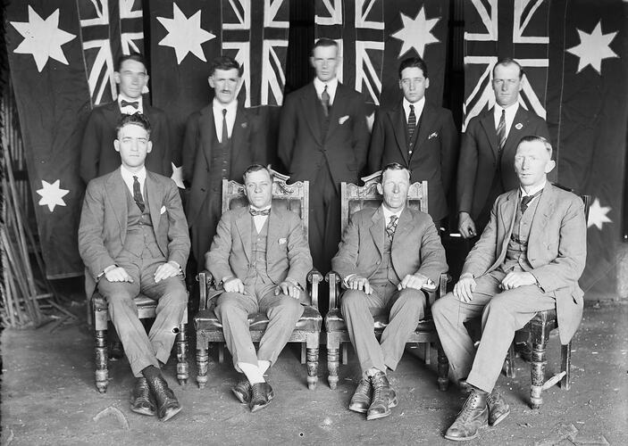 A black and white, half plate negative featuring a group portrait of men in suits against a backdrop of what appear to be Australian flags. The men are positioned in two rows, with two men in the centre seated in high backed chairs and another two seated in regular chairs.The provenance of this image is unclear, but it came from the Kodak corporate museum at Coburg.