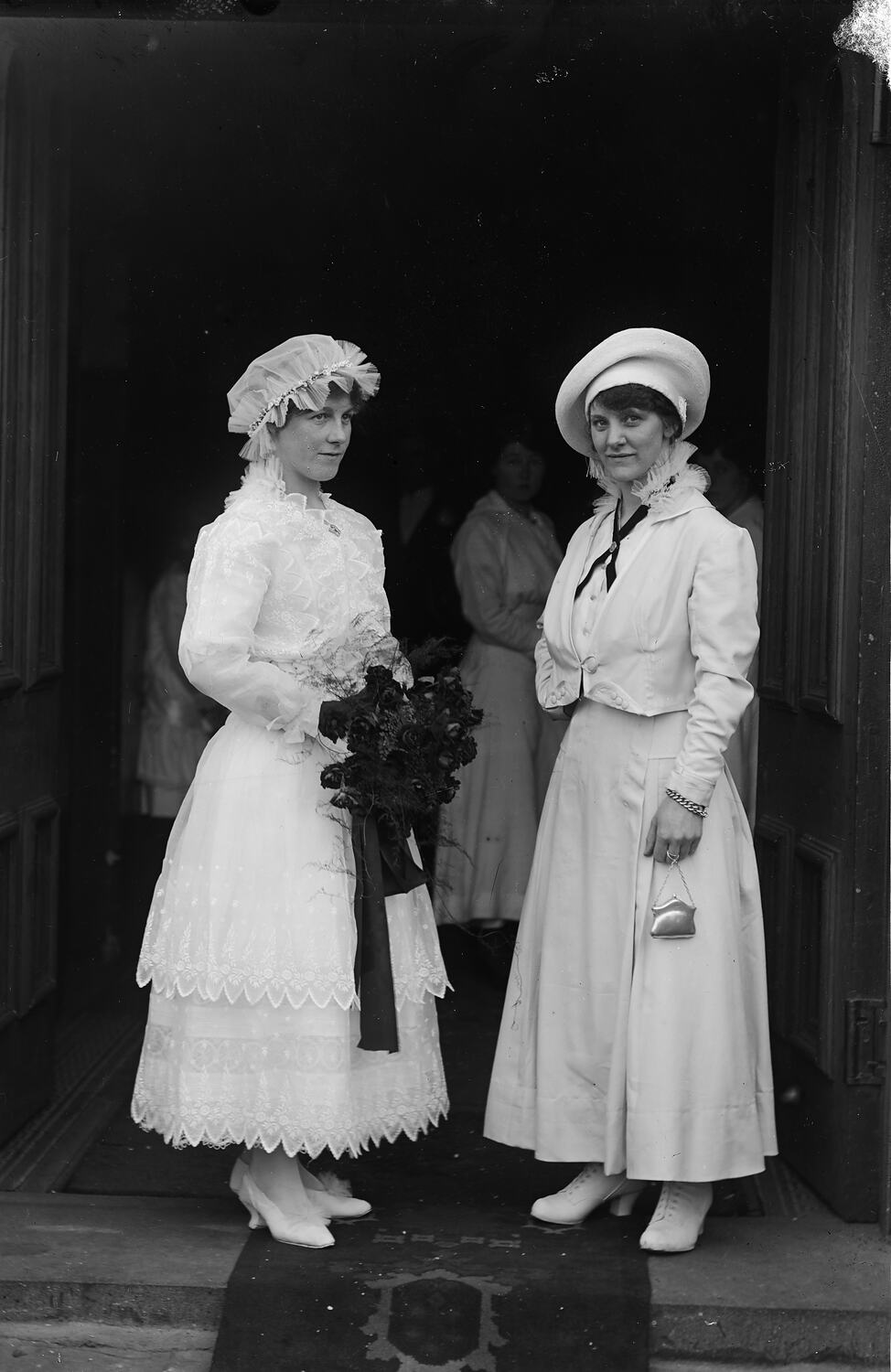 A black and white, half plate negative featuring a photograph of two women in dresses in the entranceway of a building , with a patterened runner rug underneath their feet. One woman is wearing a cloth bonnet and holding a bouquet of flowers. The provenance of this image is unclear, but it came from the Kodak corporate museum at Coburg.