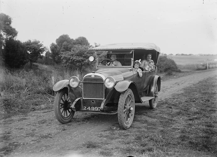 A black and white, half plate negative featuring a photograph of a family in a motor car on a country road by the sea, circa 1930s. The provenance of this image is unclear, but it came from the Kodak corporate museum at Coburg.