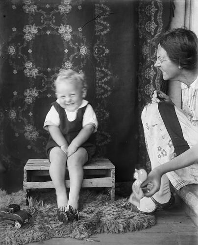 A black and white, half plate negative featuring a photograph of a toddler/small boy sitting and laughing on a low bench, while an older woman to the left smiles and holds a toy duck. On the ground before him are several toys and behind him there is a draped floral and lace tablecloth, hung as a backdrop. The provenance of this image is unclear, but it came from the Kodak corporate museum at Coburg.