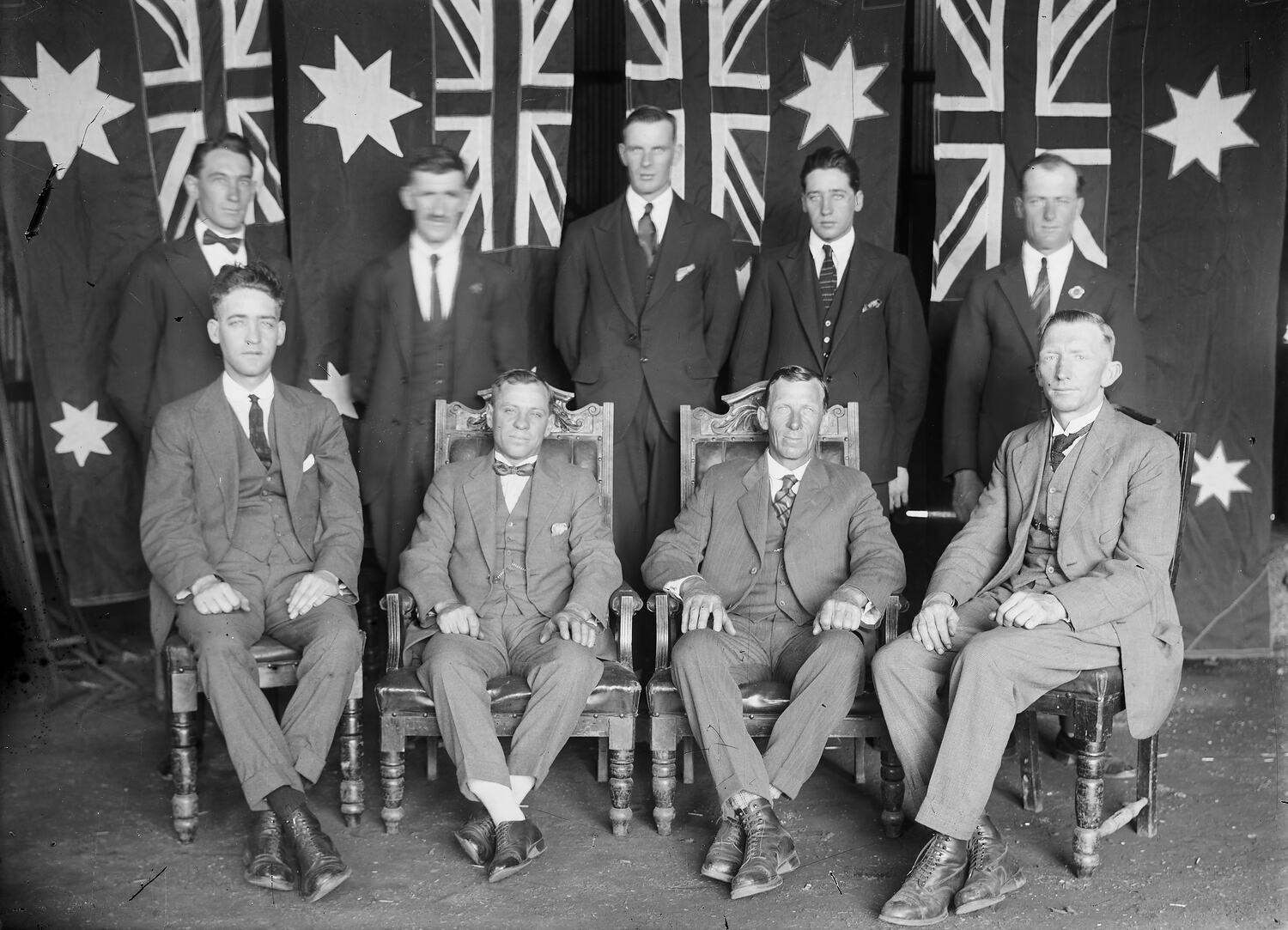 A black and white, half plate negative featuring a group portrait of men in suits against a backdrop of what appear to be Australian flags. The men are positioned in two rows, with two men in the centre seated in high backed chairs and another two seated in regular chairs.The provenance of this image is unclear, but it came from the Kodak corporate museum at Coburg.