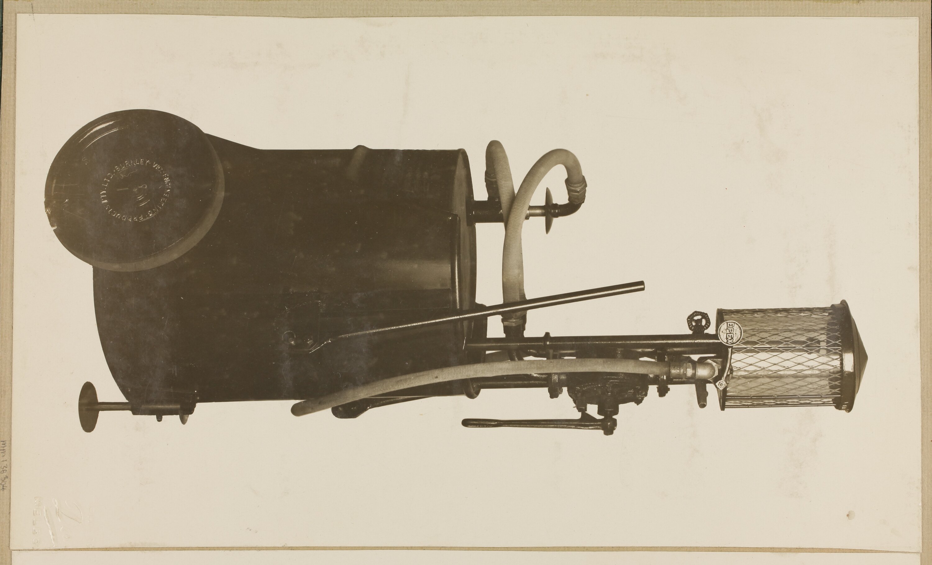 Product image of a chariot type visible single cylinder portable petrol measure, side view. The background has been deep etched.