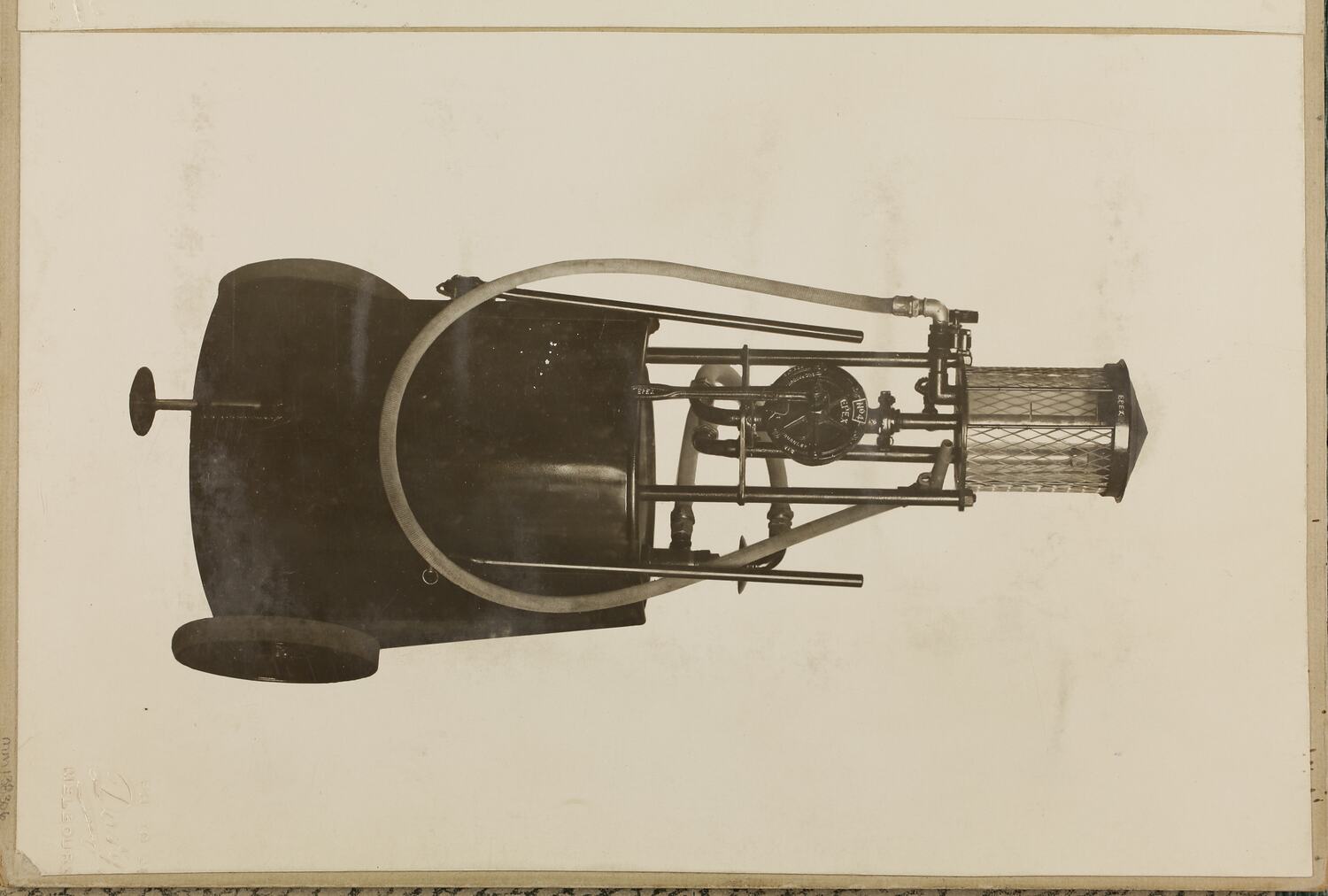 Product image of a chariot type visible single cylinder portable petrol measure, angled view. The background has been deep etched.