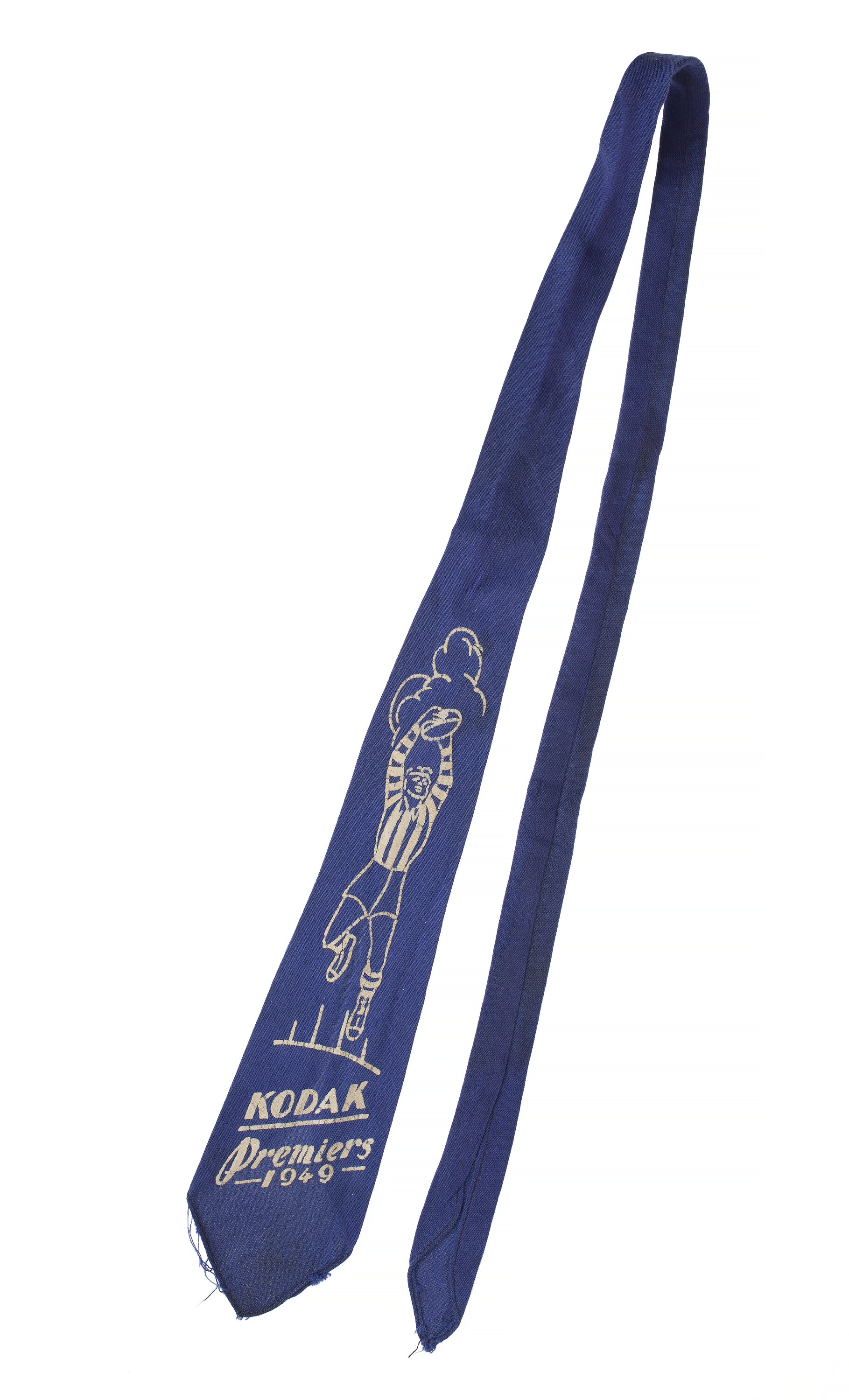 The tie was donated by Mr Walter Whitworth, ruck of the Kodak football team, who told Museums Victoria that he kicked the winning goal in the premiership match. He recalled that Kodak's Managing Director, Mr Edgar Rouse, was so thrilled with the premiership win by the company team that he presented all of the players with specially made 'premiers ties', and also generously gave the team a weekend away at a hotel in Cowes on Philip Island as a reward for their great sporting achievement. Walter proudly wore his tie for years afterwards at special events, including at the Kodak Balls held at the St Kilda Town Hall.
