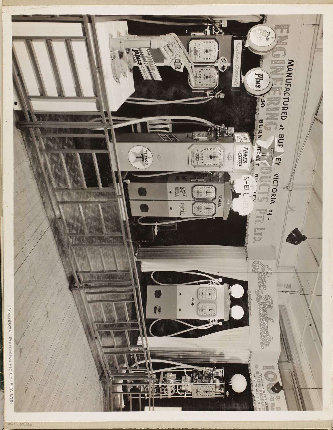 Exhibition display of Epex-Beckmeter electrical petrol pumps, manufactured by Engineering Products Pty Ltd. Five pumps are visible, three are twin pumps. Various petrol brands are labelled on them, these are, Super Plus Ethyl, Plus Penzoil, Texaco, and Shell.