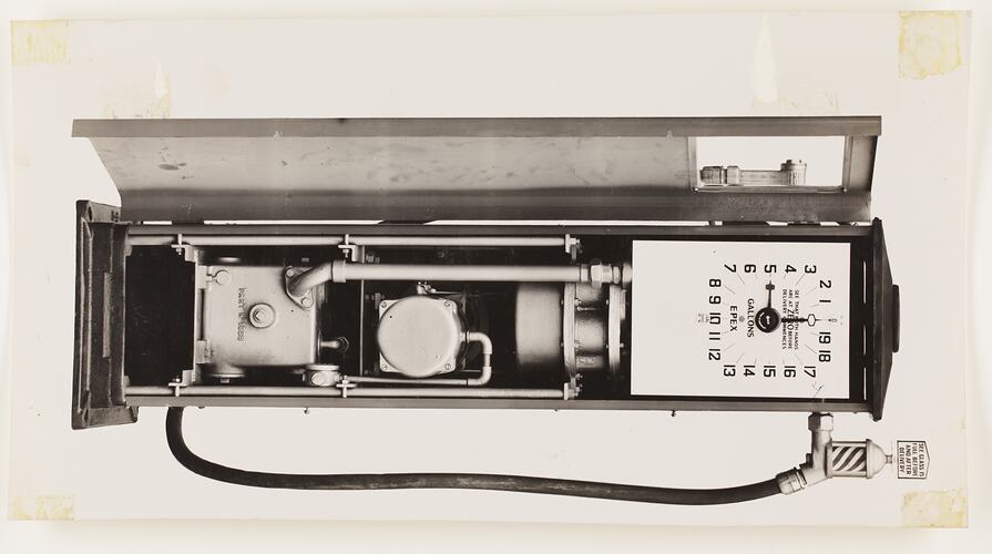 One of 59 black & white photographs contained in a photographic album. Images depict petrol pumps manufactured by Engineering Products Pty. Ltd., EPEX. The photographs are mounted to both sides of the album pages, some images have become detached from the page and are now housed separately.
