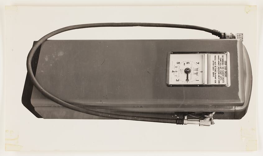One of 59 black & white photographs contained in a photographic album. Images depict petrol pumps manufactured by Engineering Products Pty. Ltd., EPEX. The photographs are mounted to both sides of the album pages, some images have become detached from the page and are now housed separately.