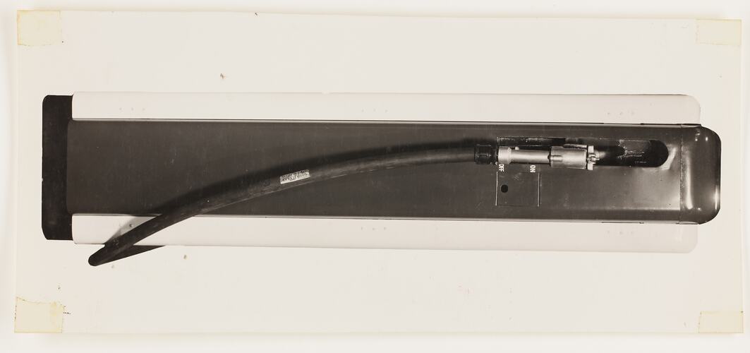 One of 59 black & white photographs contained in a photographic album. Images depict petrol pumps manufactured by Engineering Products Pty. Ltd., EPEX. The photographs are mounted to both sides of the album pages, some images have become detached from the page and are now housed separately.