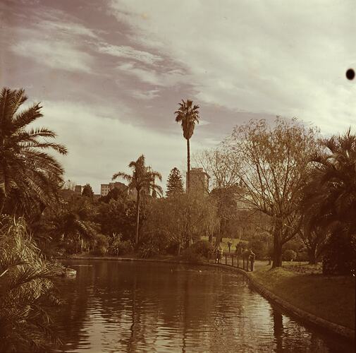 A colour lantern slide featuring the Ornamental Lake in Sydney's Royal Botanic Gardens, circa 1940s. The provenance of this image is unclear, but it came from the Kodak corporate museum at Coburg.