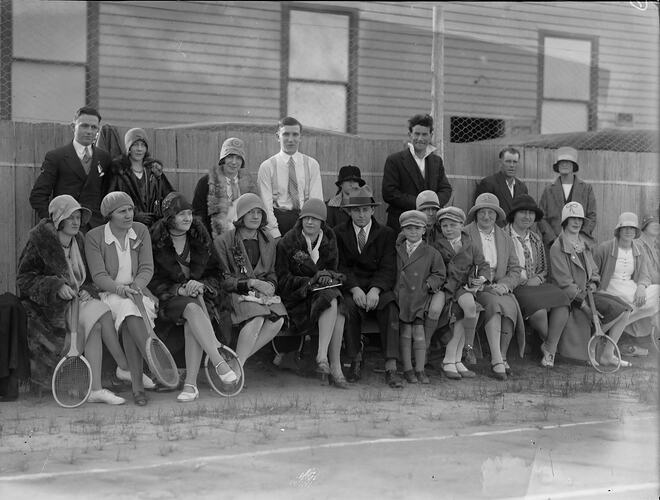 A black and white, half plate negative featuring a group of men, women and children along a fence line, at the edge of grassed area. Several women are holding tennis racquets, so this is likely the sidelines of a tennis court. The provenance of this image is unclear, but it came from the Kodak corporate museum at Coburg.