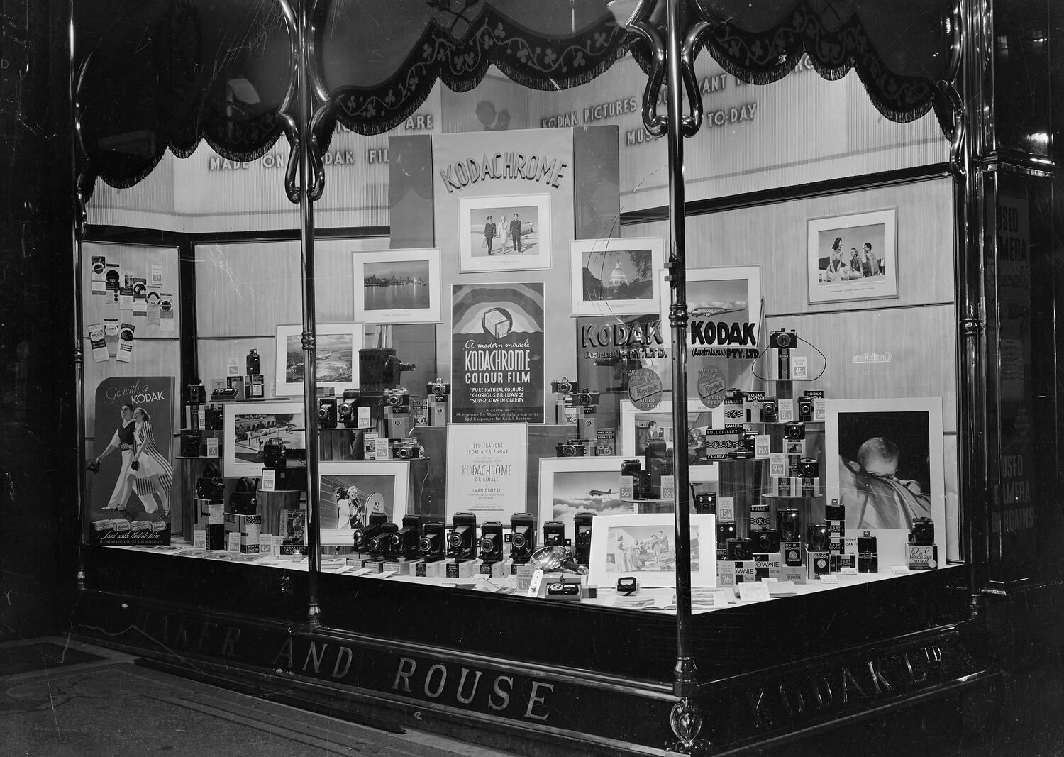 Black and white film negative of a Kodak Australasia Pty Ltd Kodachrome Colour Film shopfront display in Sydney, taken in the 1940s.