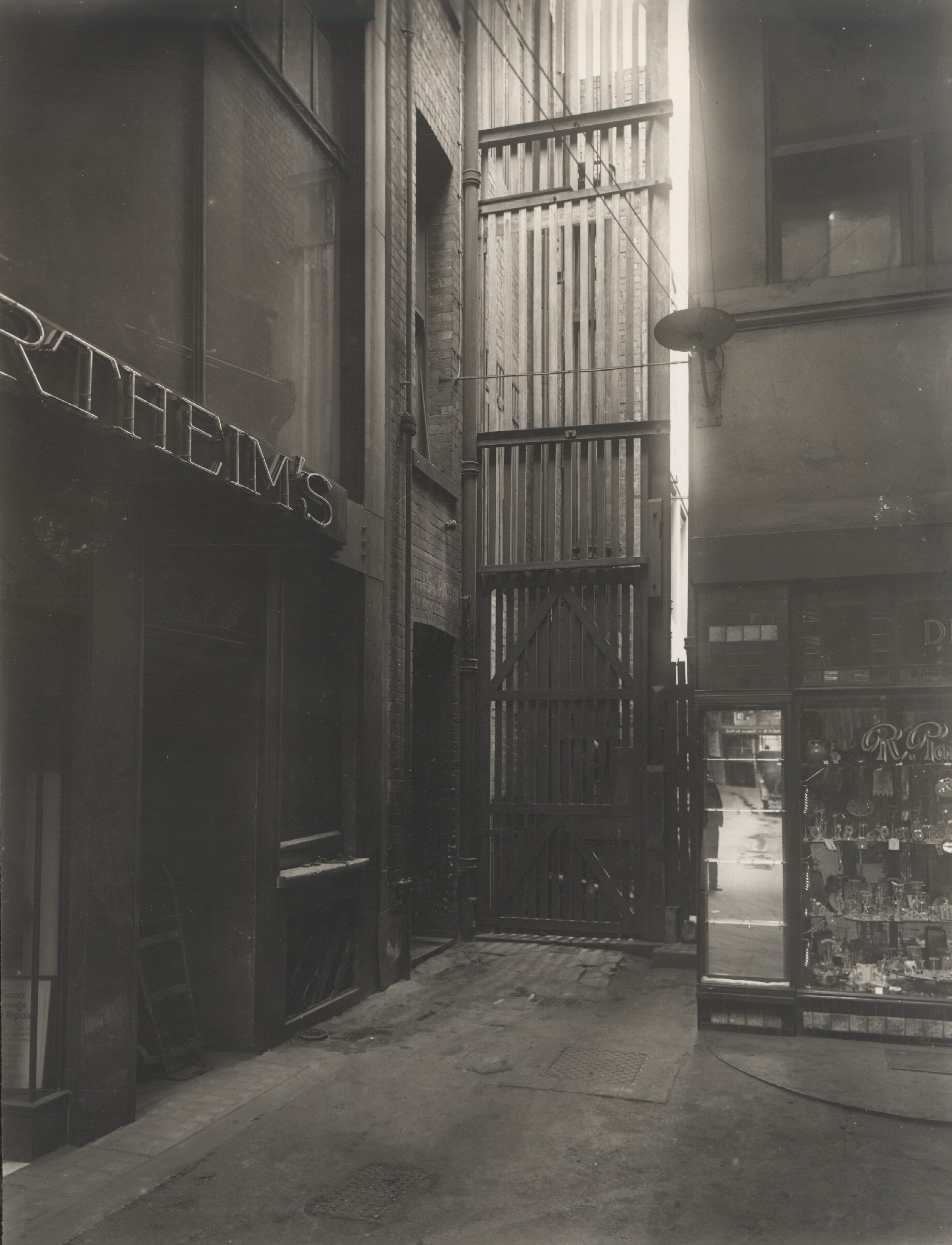 It was originally housed in a box containing 2 black and white photographs and 2 black and white negatives of the back of the Kodak Australasia Pty Ltd retail store 'Kodak House' at 252 Collins St, as seen from Howey Place and Carson Place, Melbourne.