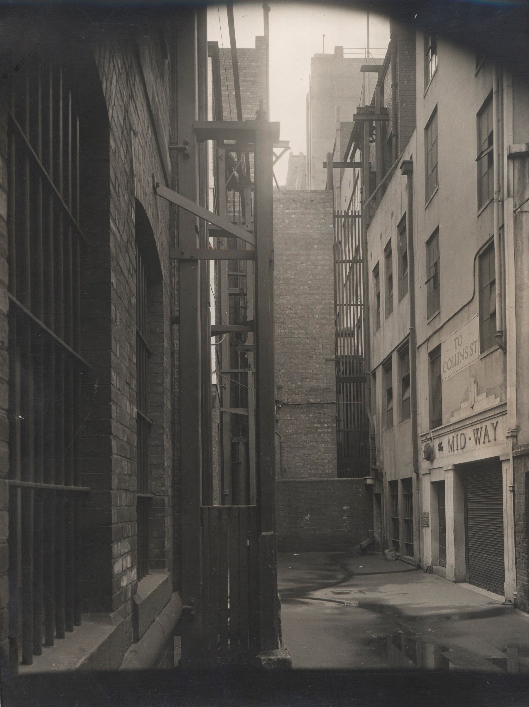 It was originally housed in a brown paper envelope in a box containing 2 black and white photographs and 2 black and white negatives of the back of the Kodak Australasia Pty Ltd retail store 'Kodak House' at 252 Collins St, as seen from Howey Place and Carson Place, Melbourne.