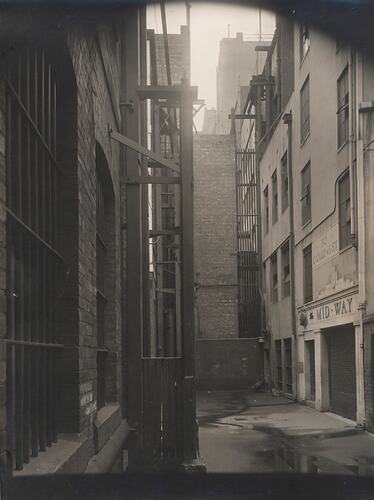 Alley between multistorey brick and concrete buildings with gated goods lifts. On the right there is a sign reading 'To Collins St' and beneath that a double roller door with 'MID-WAY' written above it and a large alarm. There is water pooling in the alley.