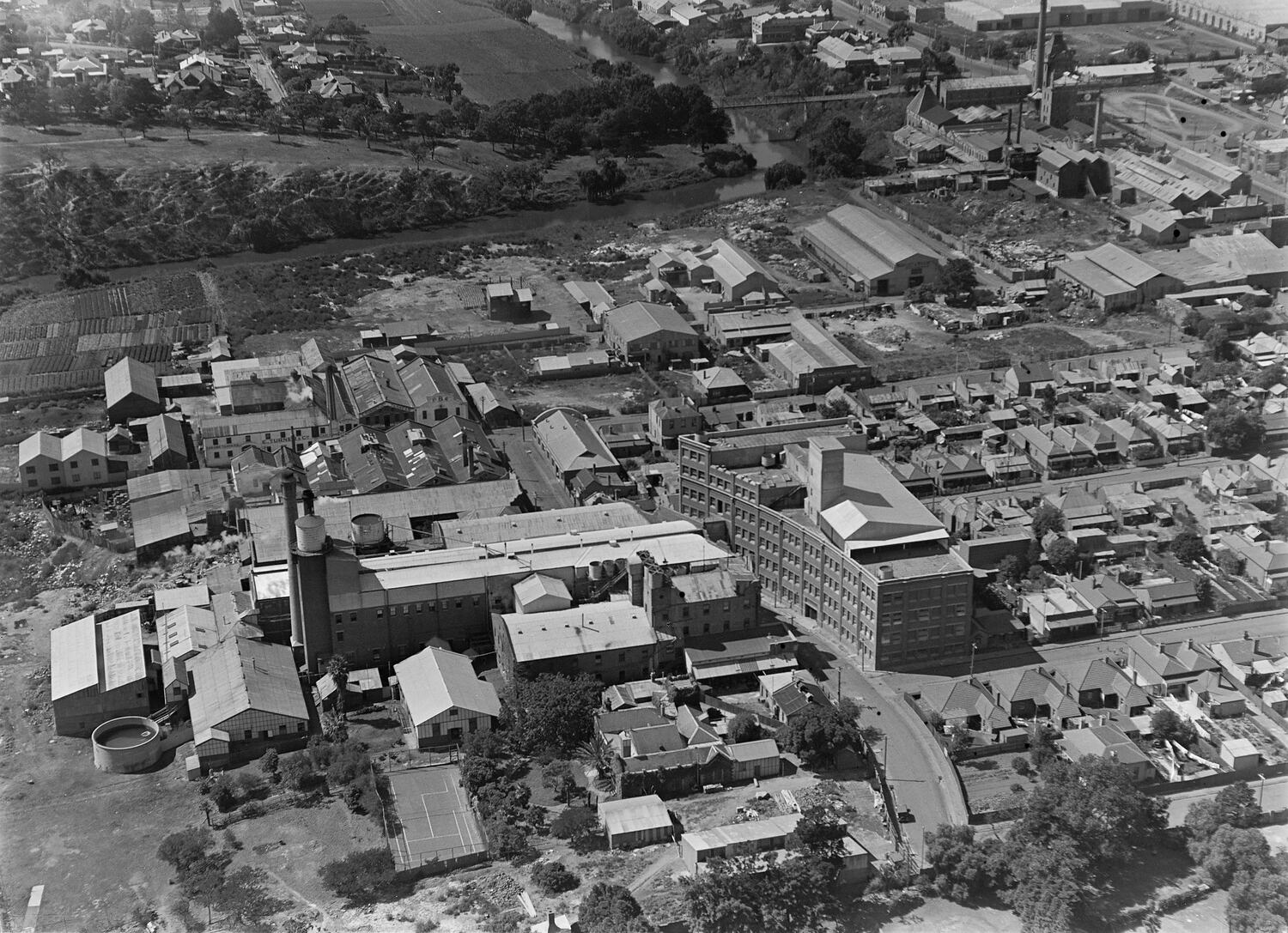 Black and white, half plate glass negative featuring an aerial view of the Kodak Australasia Pty Ltd factory at Abbotsford, circa 1930s. This oblique view looks south east and shows the multistorey curved building on Southampton crescent and various factory buildings in the lower centre of frame, including silver recovery tanks and tennis courts in the lower foreground. In the upper left the Yarra River is visible with market gardens on the Western bank and parkland to the East. Suburban streets and houses are visible beyond the factory complex to the East.