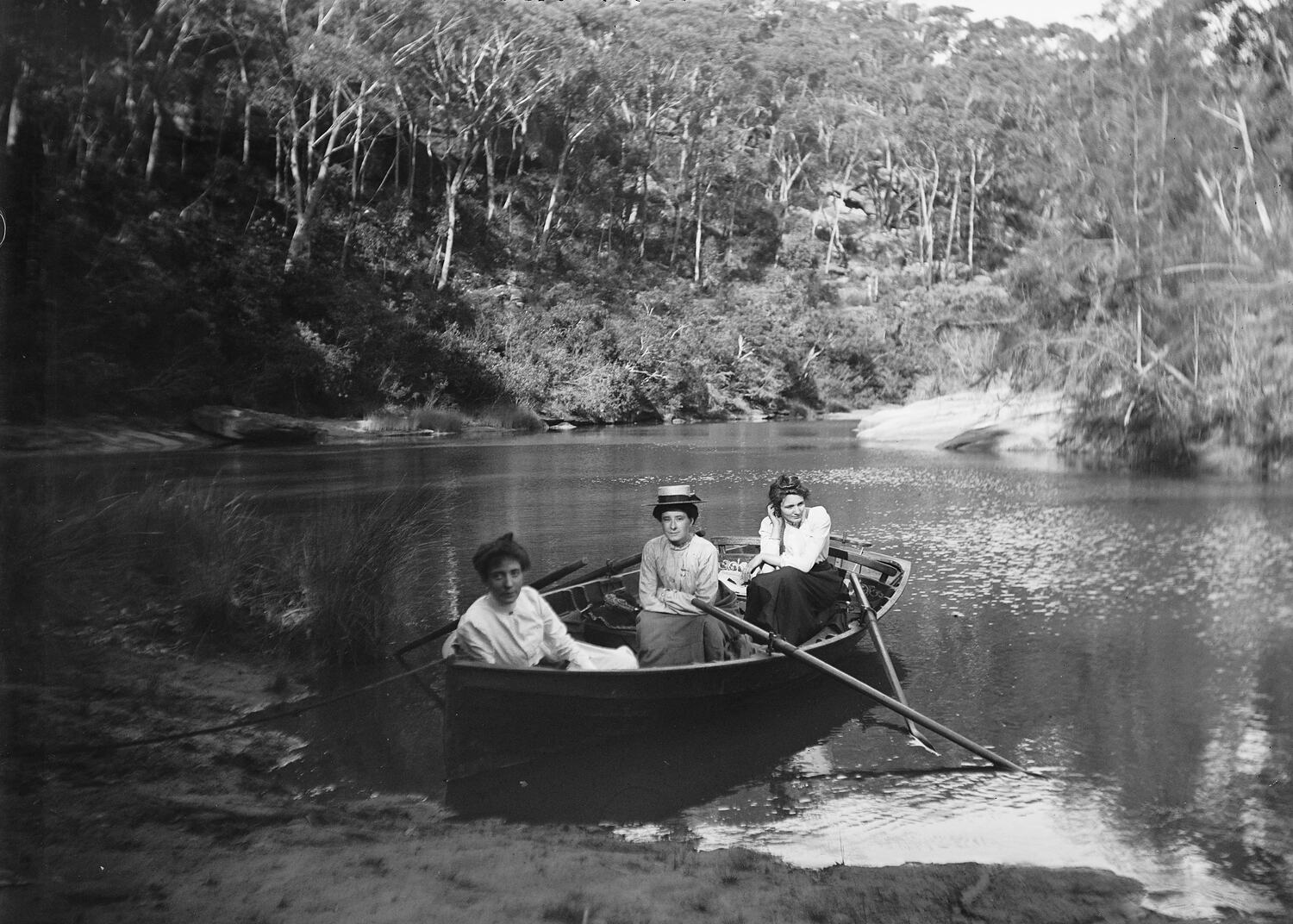 Three women in a row boat, moored at the shore of a river, with a steep bank sparsely covered with eucalypts and grasses.