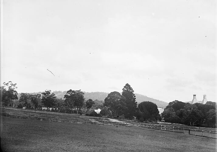 Black and white 1/4 plate glass negative featuring paddocks and a farm house with two chimneys visible behind a plantation of European trees. Likely taken circa 1900s.