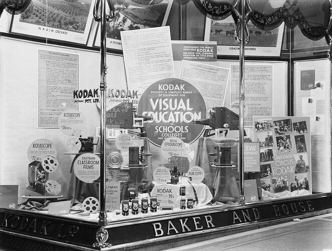 Black and white, 1/4 plate glass negative of the shopfront display at Sydney's Kodak branch at 379-381 George Street, circa 1933-1938. The promotion is for Kodak Visual Education in schools and colleges, and there are some products such as the Kodascope Model D and L projectors, a Ross Epidiascope and Kodak slide accessories.