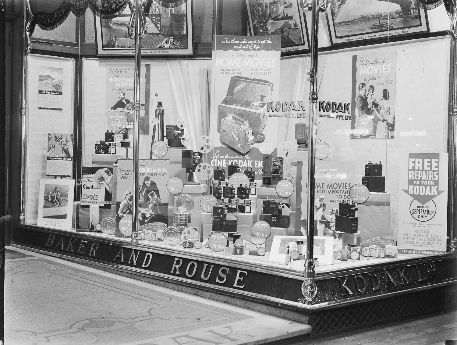 Shopfront display featuring a window full of Kodak merchandise (movie cameras and accessories) and various signs and labels. Around the top of the inner display case are framed photographs of Sydney Harbour. There is a sign in the lower right for free camera repairs in September. The window glass has decorative glass 'garlands' etched into it around the top. Kodak Ltd is cast into the front, exterior skirting of the window, and 'Baker & Rouse' is similarly cast into the skirting inside the entranceway.