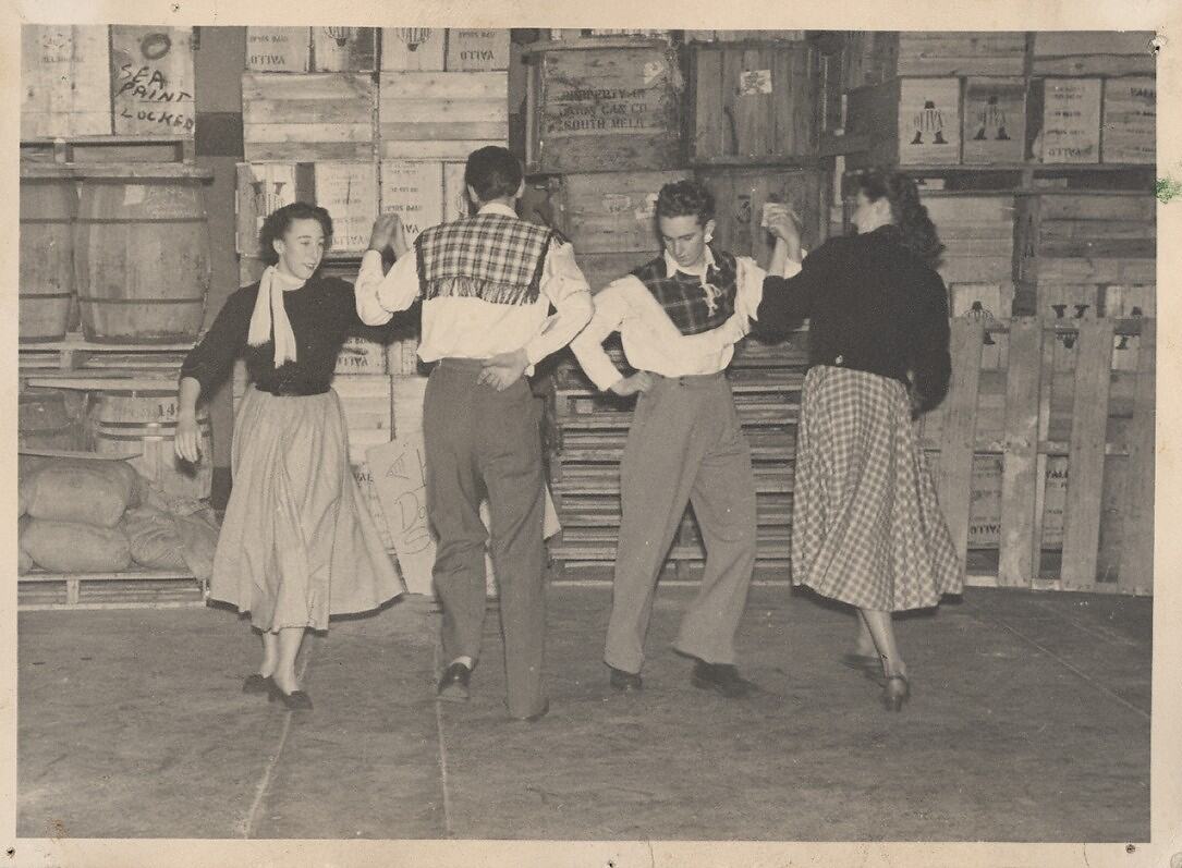 Two couples dancing in a factory storeroom, spinning in a circle holding their hands high. The women wear long skirts, one with a scarf around her neck, and the men have tasselled collars over their Western style shirts. Behind them is a tall pile of crates, barrels, bags and pallets stacked in racking.
