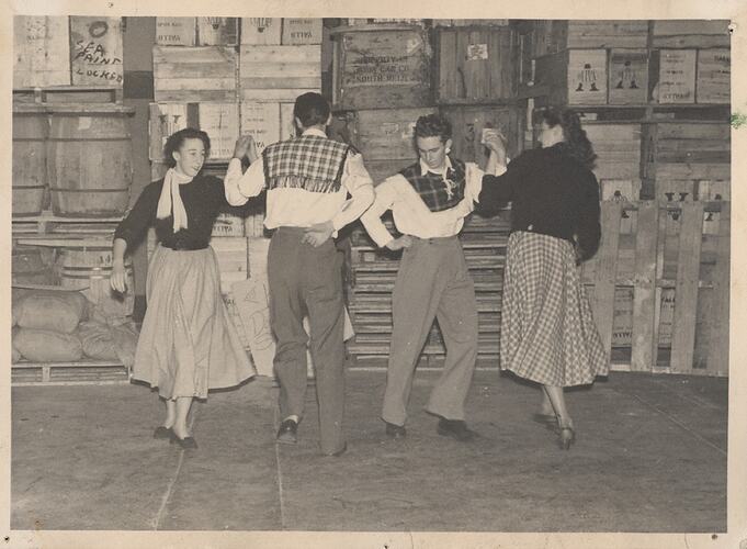 Two couples dancing as part of the Double K Square Dance Club, a social group organised by Kodak Australasia Pty Ltd staff at the Burnley factory, Richmond, circa 1950.