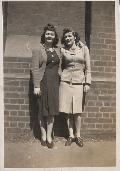 Marie McKinley (later de Camara) and another female Kodak Australasia Pty Ltd employee standing outside the Kodak Australasia Pty Ltd factory, Abbotsford circa 1946-1950.