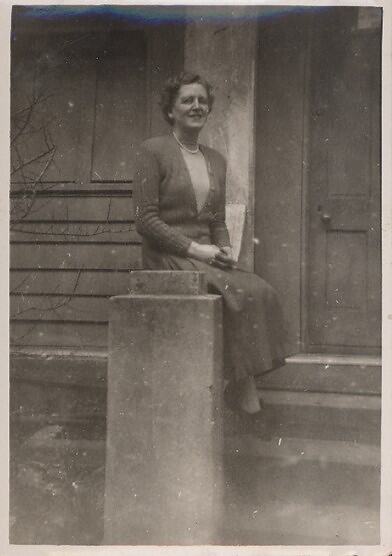 Older woman in skirt, cardigan and pearls is seated on a cement banister or balustrade, beside a set of low steps leading to the doorway of a weather-board building. A leafless deciduous tree is visible to the left of the image.