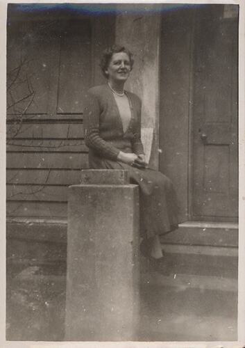Pearl Cleaver, manager of the Kodak Australasia Pty Ltd Powder and Solution Department, pictured sitting outside the Yarra Grange 'cottage' at Kodak's Abbotsford factory, circa 1946-1950. The Powder and Solution Department operated out of part of Yarra Grange at this time, before moving to Burnley.