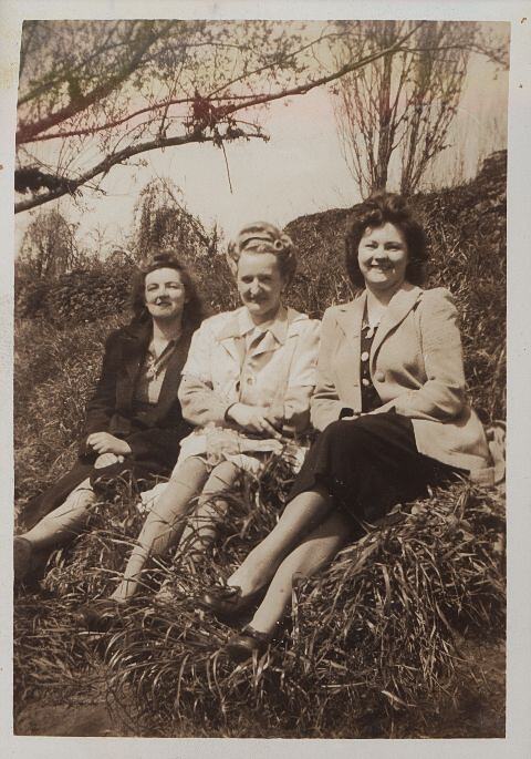 Three women in coats and dresses sit on a steep, grassy slope or river bank. There are trees visible in the background, on top of the bank.