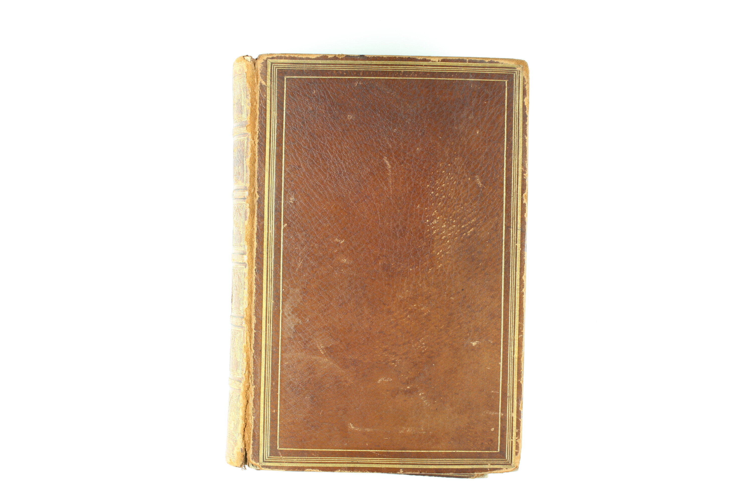 Brown, hard cover book with gold embossed border around cover and edging of page leaves. 902 printed pages. Inside page includes handwritten inscriptions.