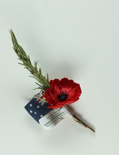 The buttonhole was one of two worn by Museum Victoria CEO Patrick Greene and his young son on 25 April 2014, during Anzac Day commemorations at Melbourne's Shrine of Remembrance. Rosemary sprigs are handed out and worn at Anzac Day services. Rosemary is is believed to improve the memory, and is a symbol of both fidelity and remembrance in literature and folklore. It grows wild on the Gallipoli peninsula.
